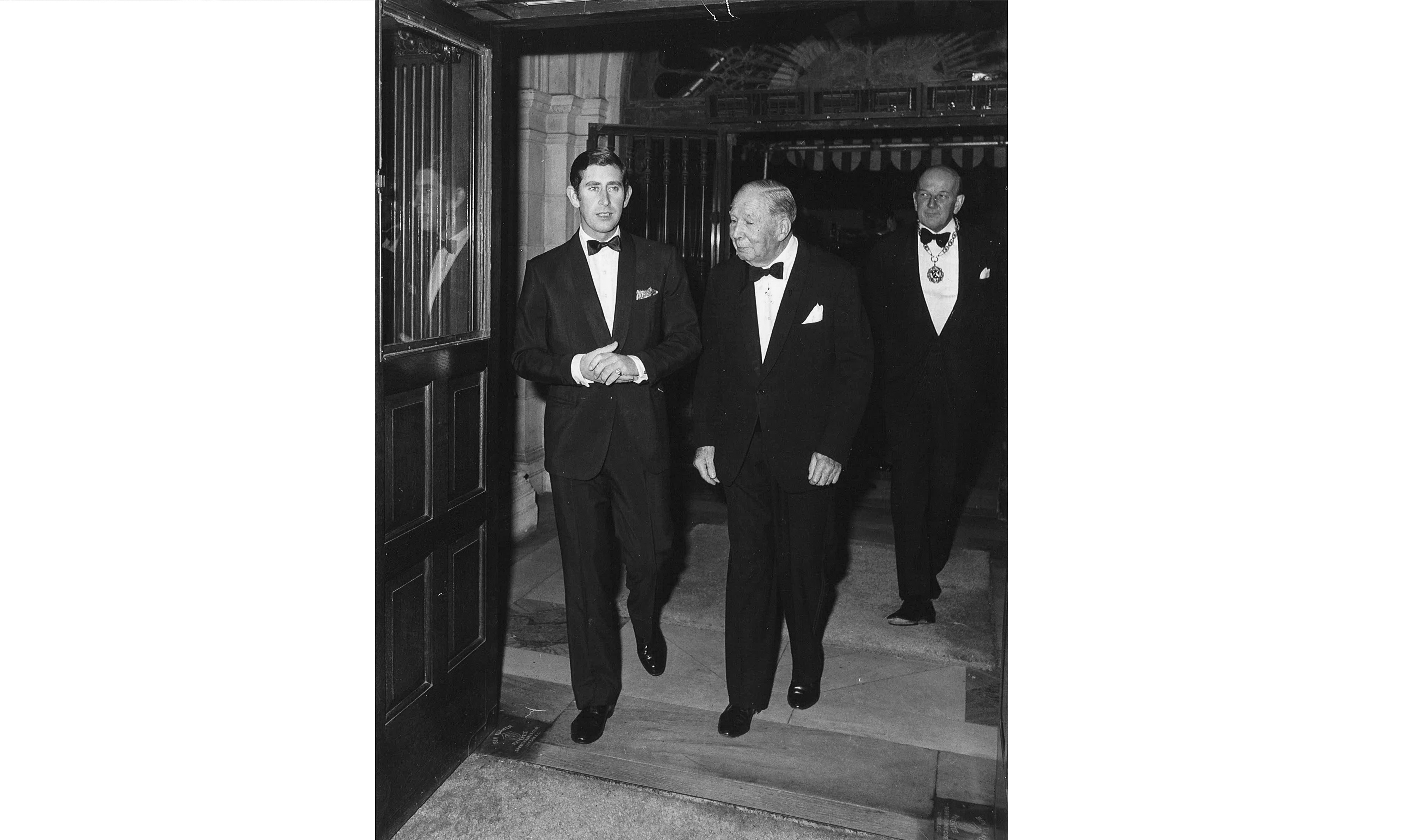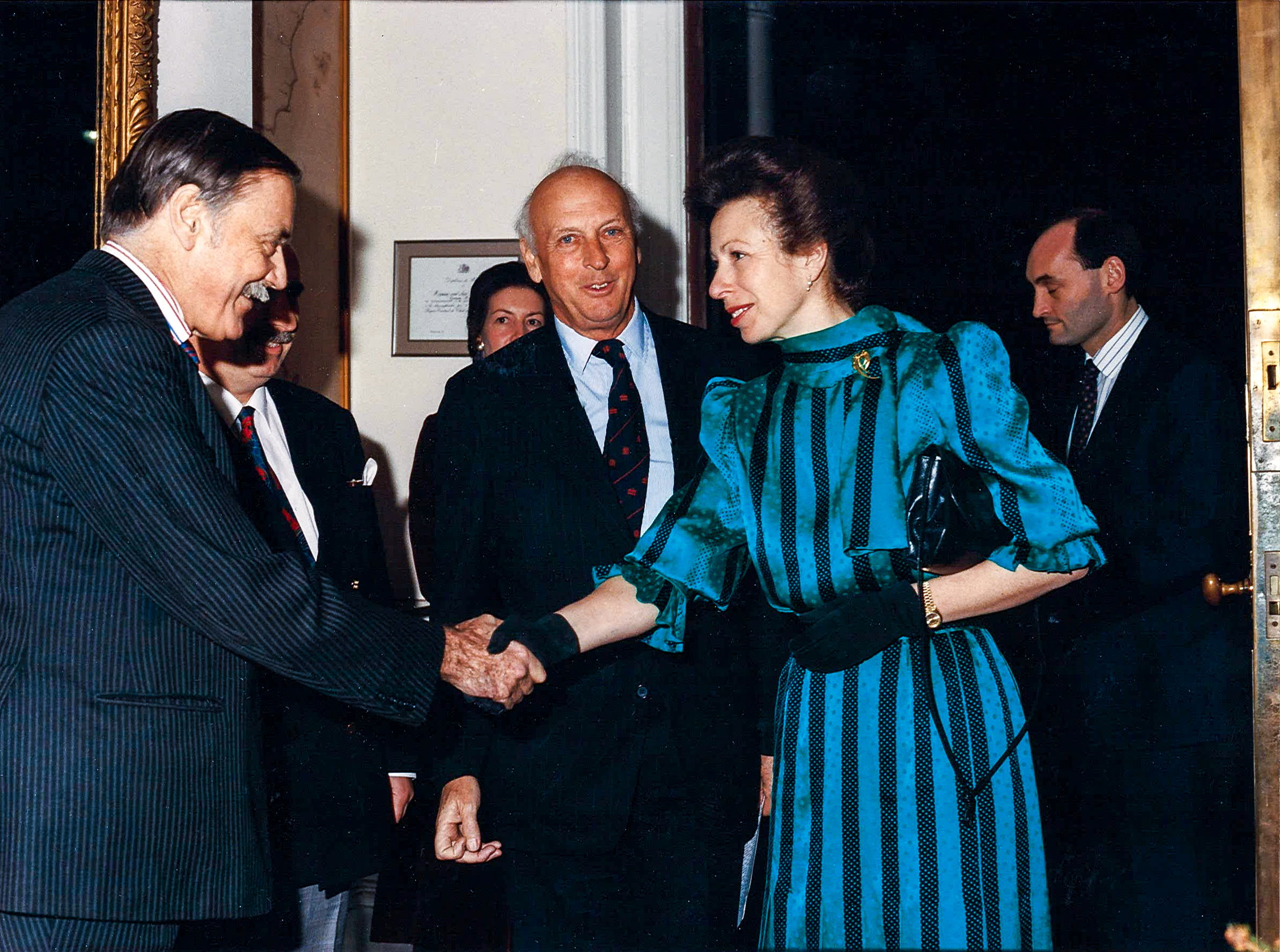 HRH is greeted by Director General Sir Michael Simpson-Orlebar prior to delivering an address at Canning House. Also pictured are Viscount Montgomery and Dr Iain Macfarlane.
