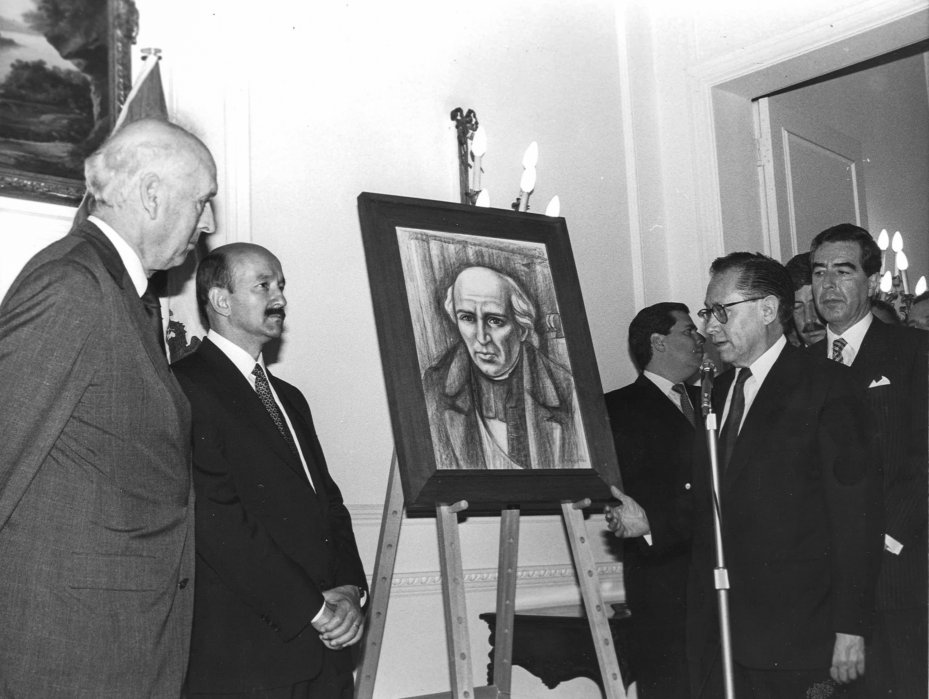 H.E. Carlos Salinas de Gortari, President of Mexico, presents a portrait of Don Miguel Hildago y Castilla, by Raul Anguiano, to Canning House