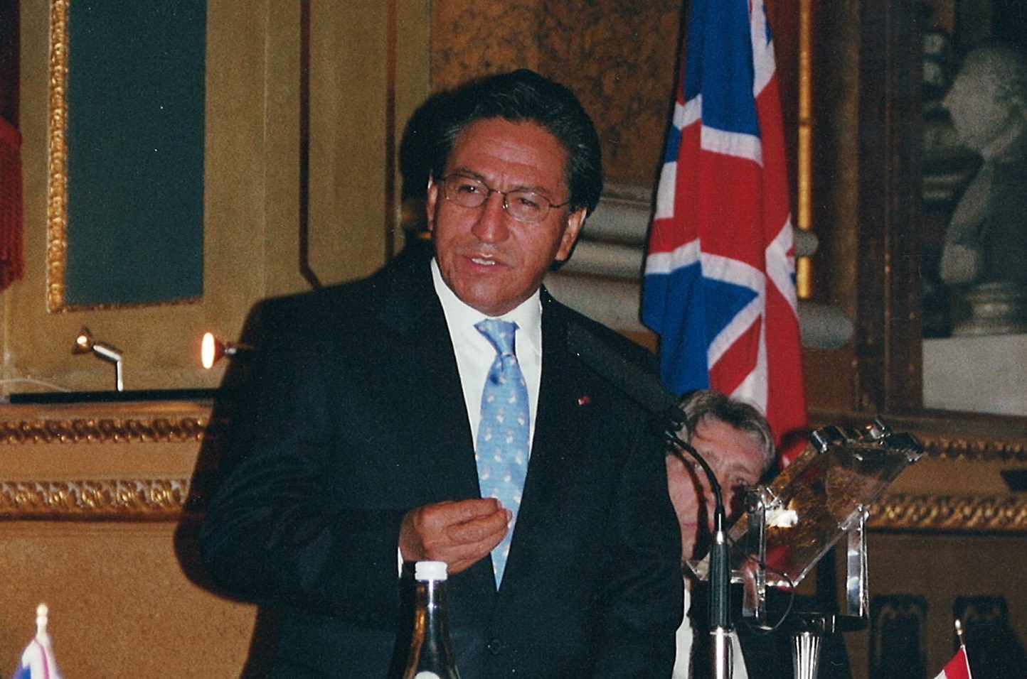 H.E. Alejandro Toledo, President of the Republic of Peru, gives a lecture in Goldsmiths Hall. Baroness Hooper, Honorary President of Canning House, introduces President Toledo.