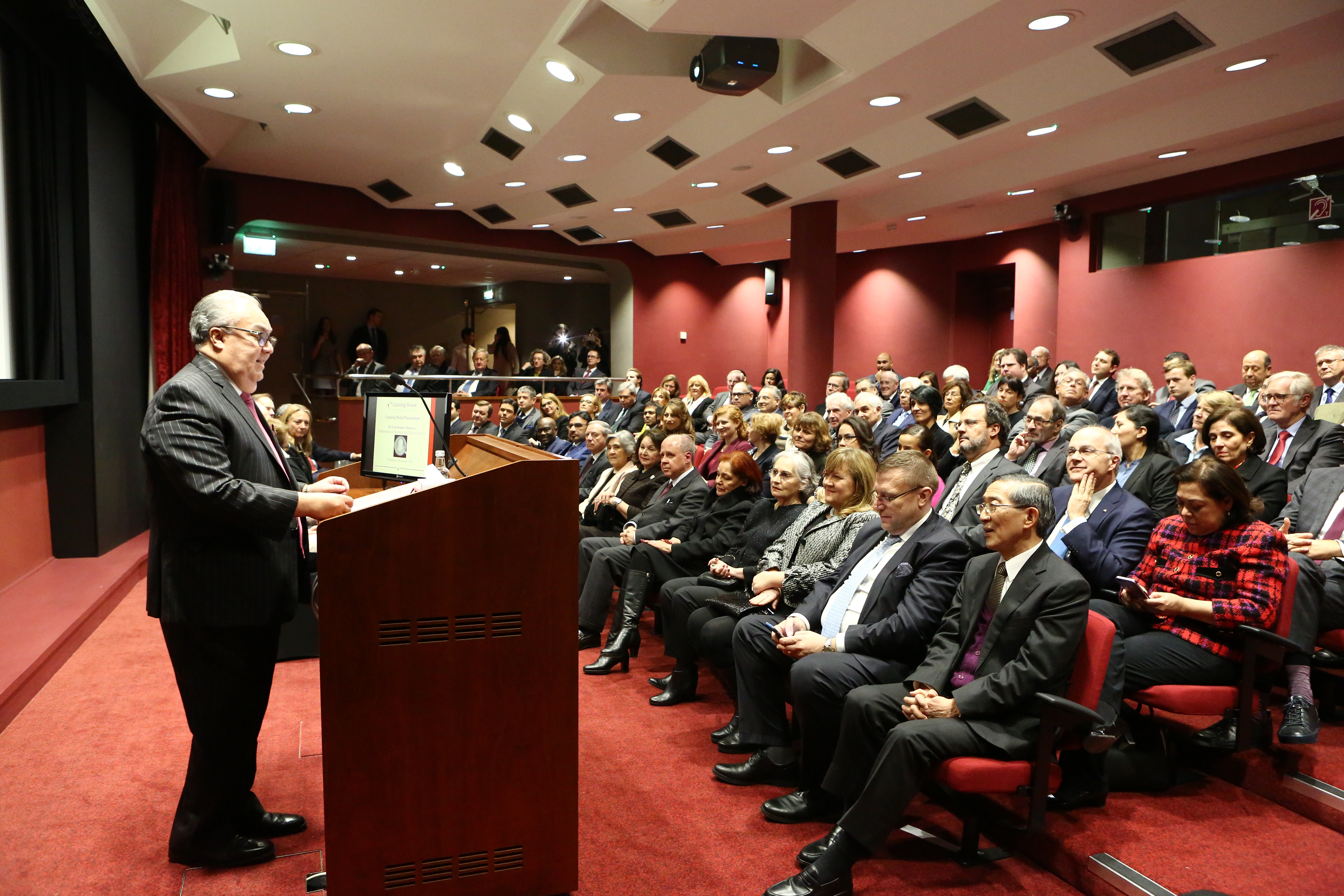 A throng of high-level representatives from the diplomatic corps, parliamentarians, distinguished members of the Latin American community in London, and leading members of Canning House filled the auditorium to celebrate the presentation of the Canning Medal to His Excellency.