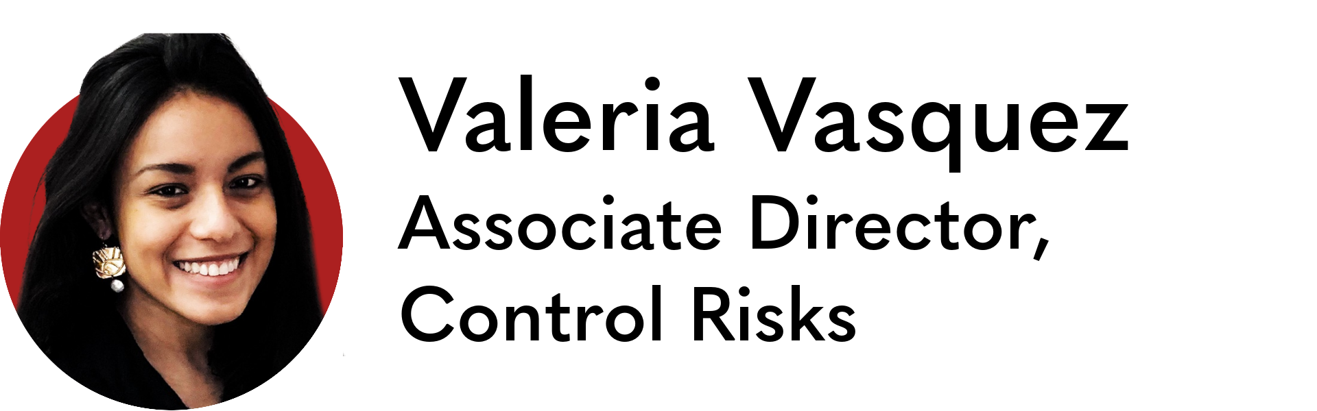 Valeria is an Associate Director on Control Risks’ Global Risk Analysis team based in Mexico City. As part of her role, Valeria provides political, operational, social and security risk analysis on Central America. She produces regular updates for Control Risks’ online subscription services, as well as bespoke consultancy projects for clients with footprints in Central America. Before joining Control Risks, Valeria worked as a freelance political and economic risk analyst, where she focused on research and analysis of political issues in Latin America and Central America.