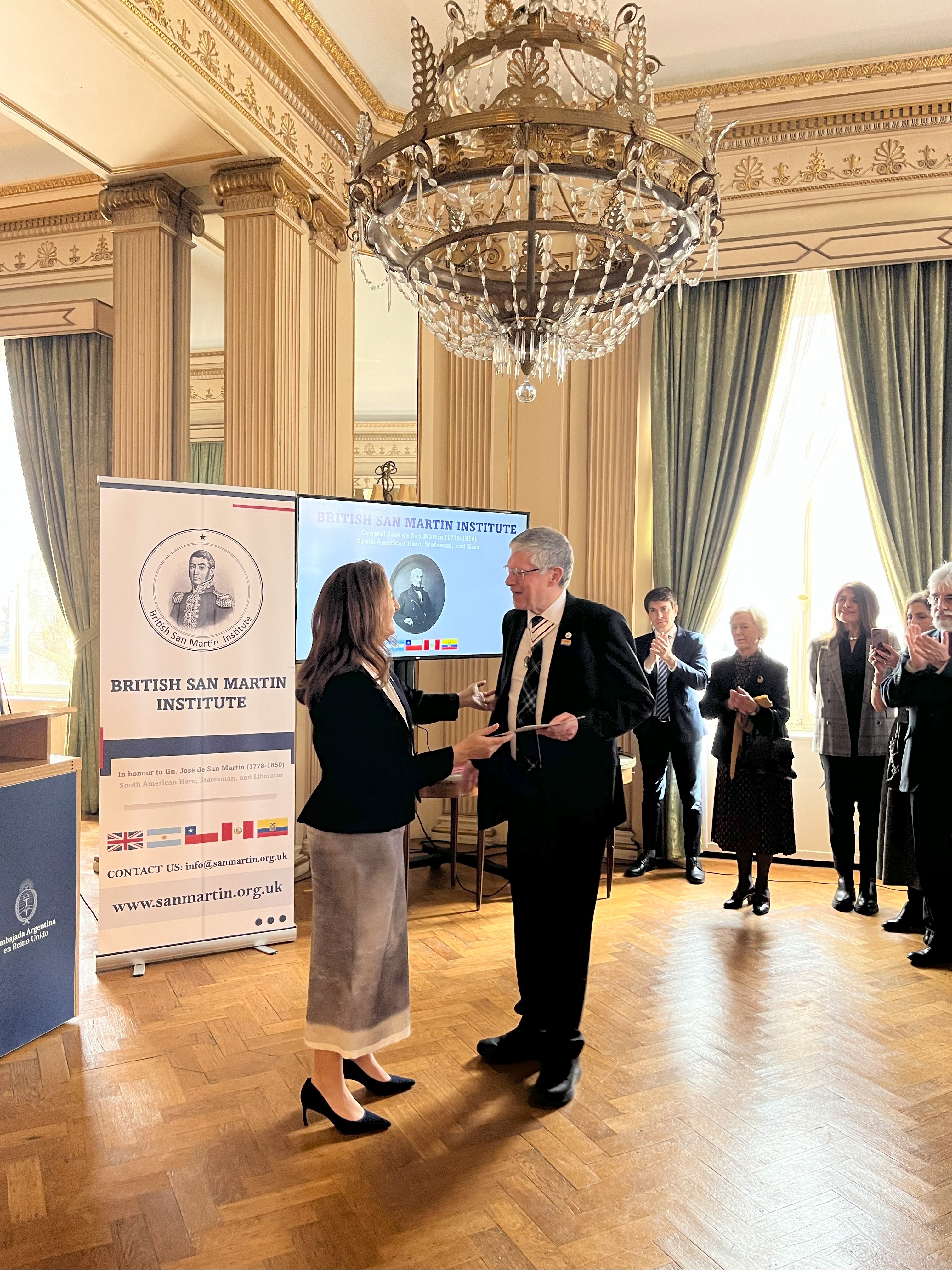The British San Martín Institute then presented several honors: the Honorific Diplomatic Chair “Paracas Bay Landing” to H.E. Ambassador Ignacio Higueras Hare of the Republic of Peru, the Honorific Academic Chair “Basil Hall” to Mr. Andrew Simpson, Lord-Lieutenant of Banffshire, and a posthumous recognition to former Ambassador Mario Campora (1930-2022) for his efforts in installing the monument to General San Martín in London.